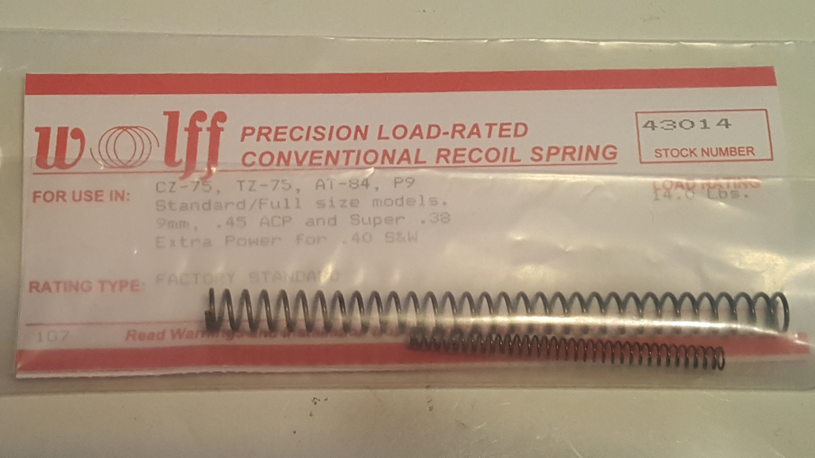 43014 Wolff CZ75 / AT84 / P9 9mm, STD RECOIL SPRING 14LB